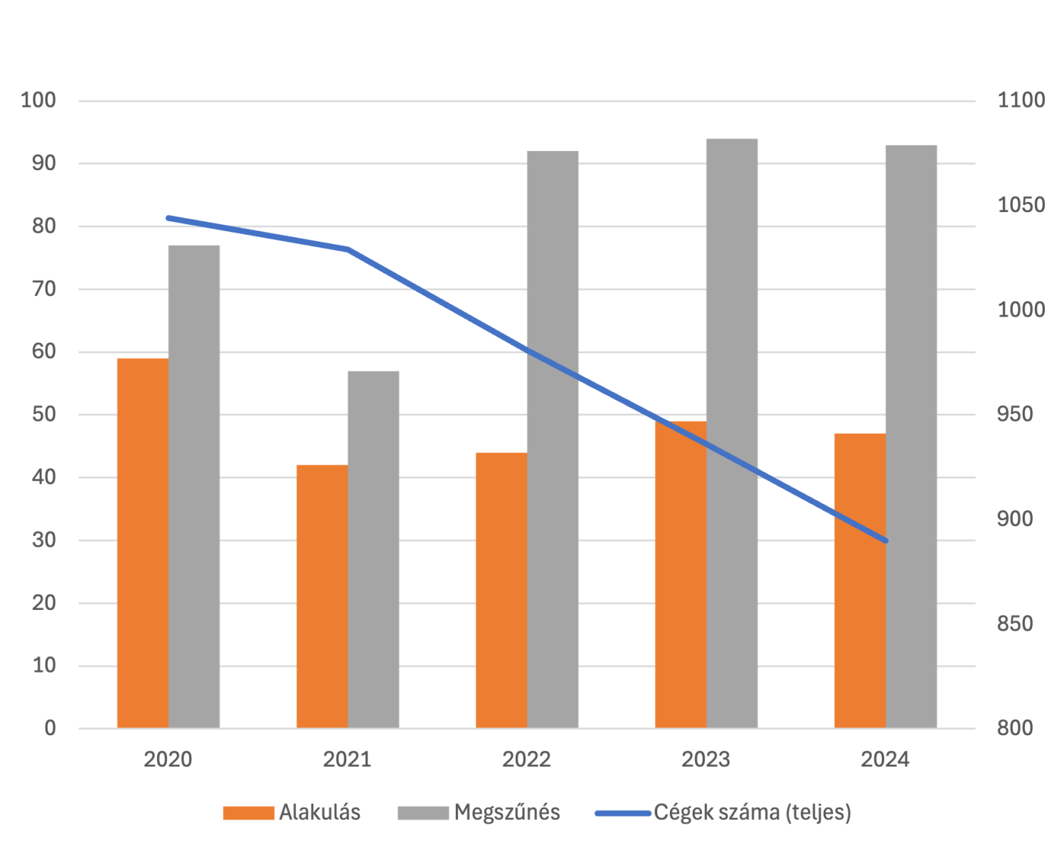 Az alakulások száma ezzel szemben mérsékelt: 2020-ban még 59 új céget jegyeztek be, 2024-ben azonban már csak 47-et. Vagyis a kilépők folyamatosan meghaladják a belépőket, ami a teljes szektor zsugorodásához vezet.