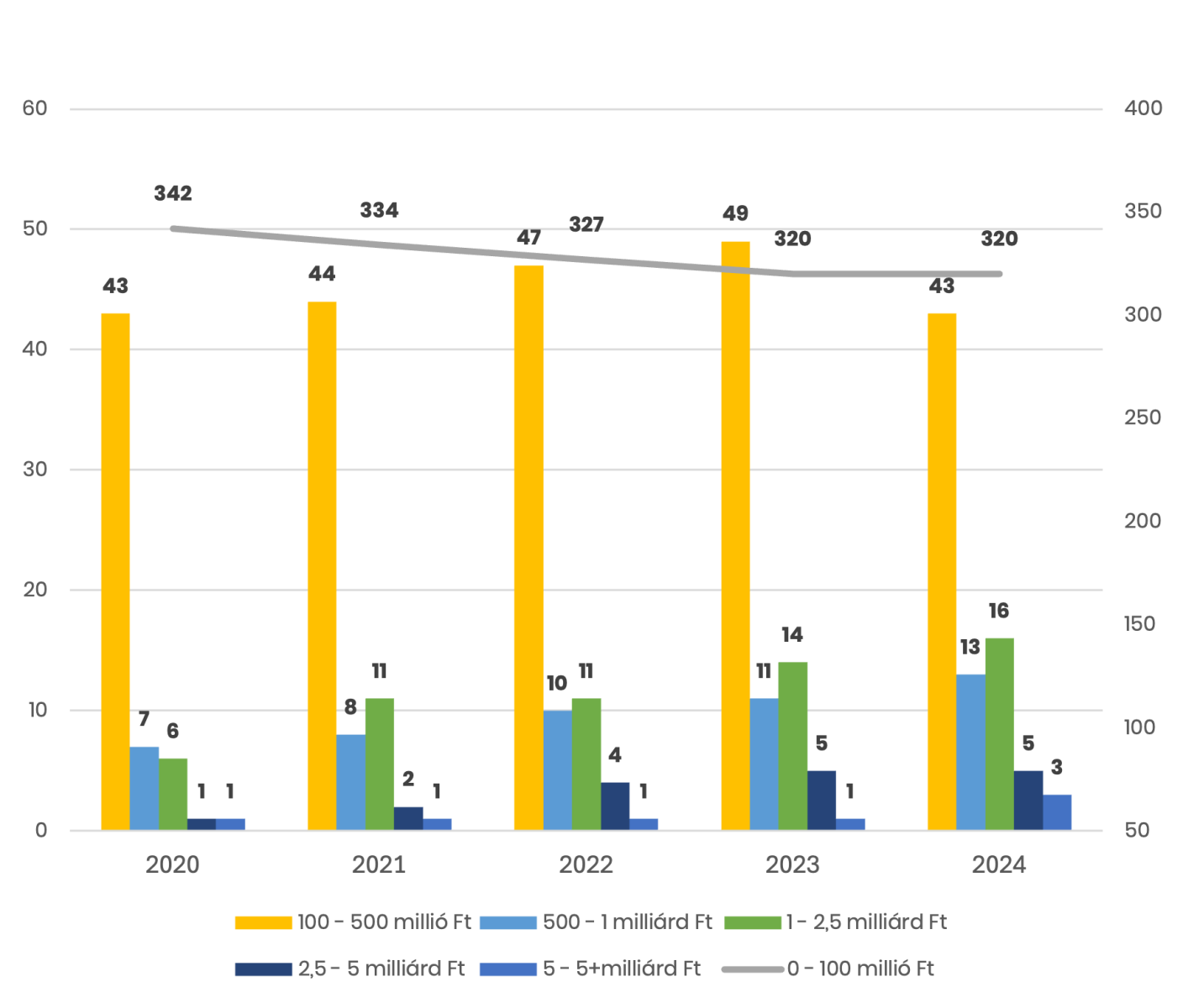 A vállalkozások többsége változatlanul a kisebb kategóriákban található: több mint 300 cég 100 millió forint alatti éves bevételt ért el, míg a 100–500 milliós sávban 43 társaság működött. A felsőbb kategóriákban lassú, de egyértelmű erősödés figyelhető meg: az 500 millió és 1 milliárd forint közötti árbevételt elérők száma ötévnyi idő alatt megduplázódott (13 cég), az 1–2,5 milliárdos sávban pedig már 16 szereplő van jelen. A legnagyobbak köre is bővült: 2024-ben három cég lépte át az 5 milliárd forintos árbevételi határt, míg korábban ez csak egy szereplőnek sikerült.
