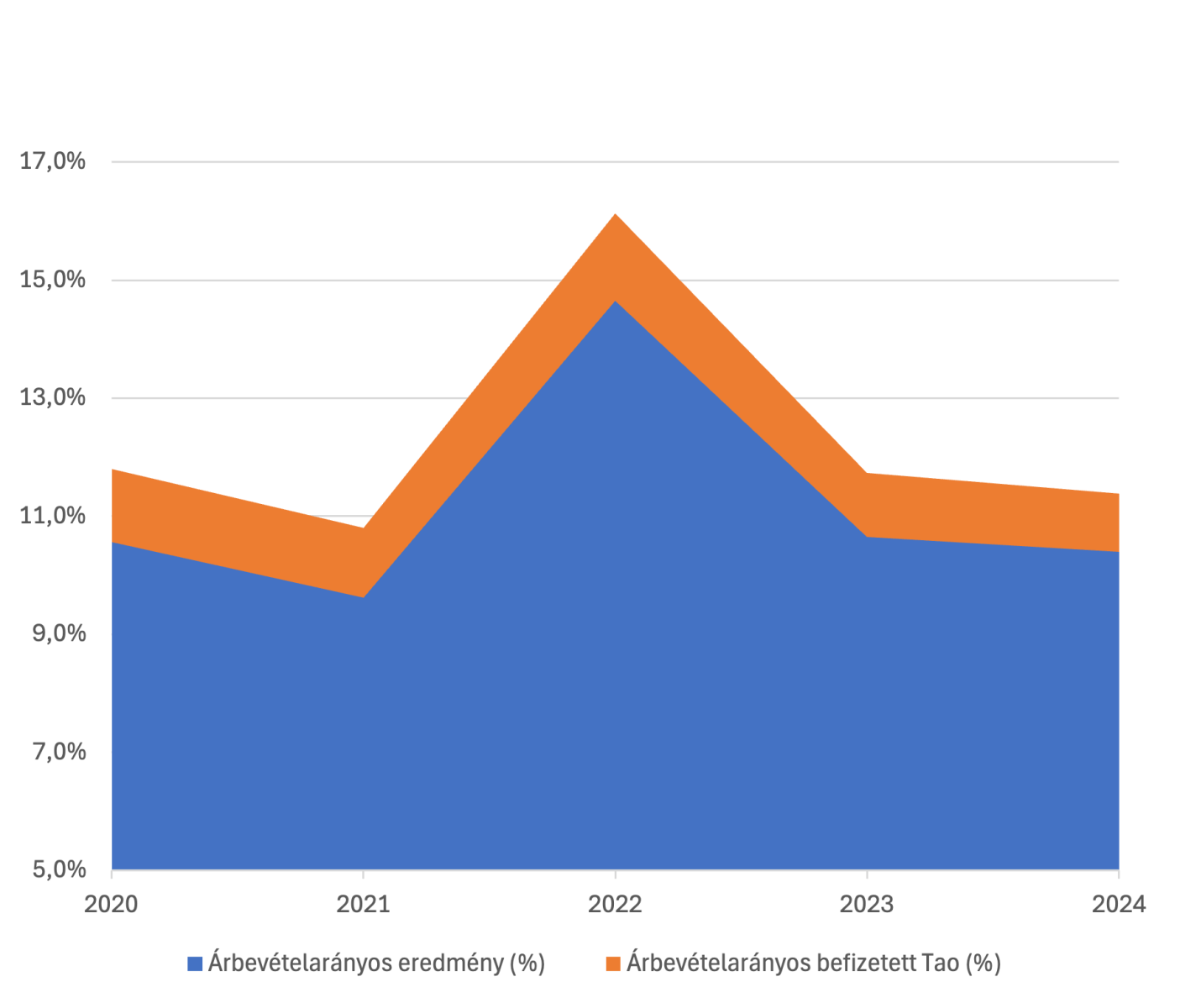 Az árbevétel-arányos eredmény 2024-ben 10,4% lett, ami gyengébb a 2022-es kiugró 14,6%-nál, de nagyjából a korábbi évek szintjén mozog. Ez a hullámzás jól mutatja, hogy a szektor jövedelmezősége érzékenyen reagál a költségek változására.