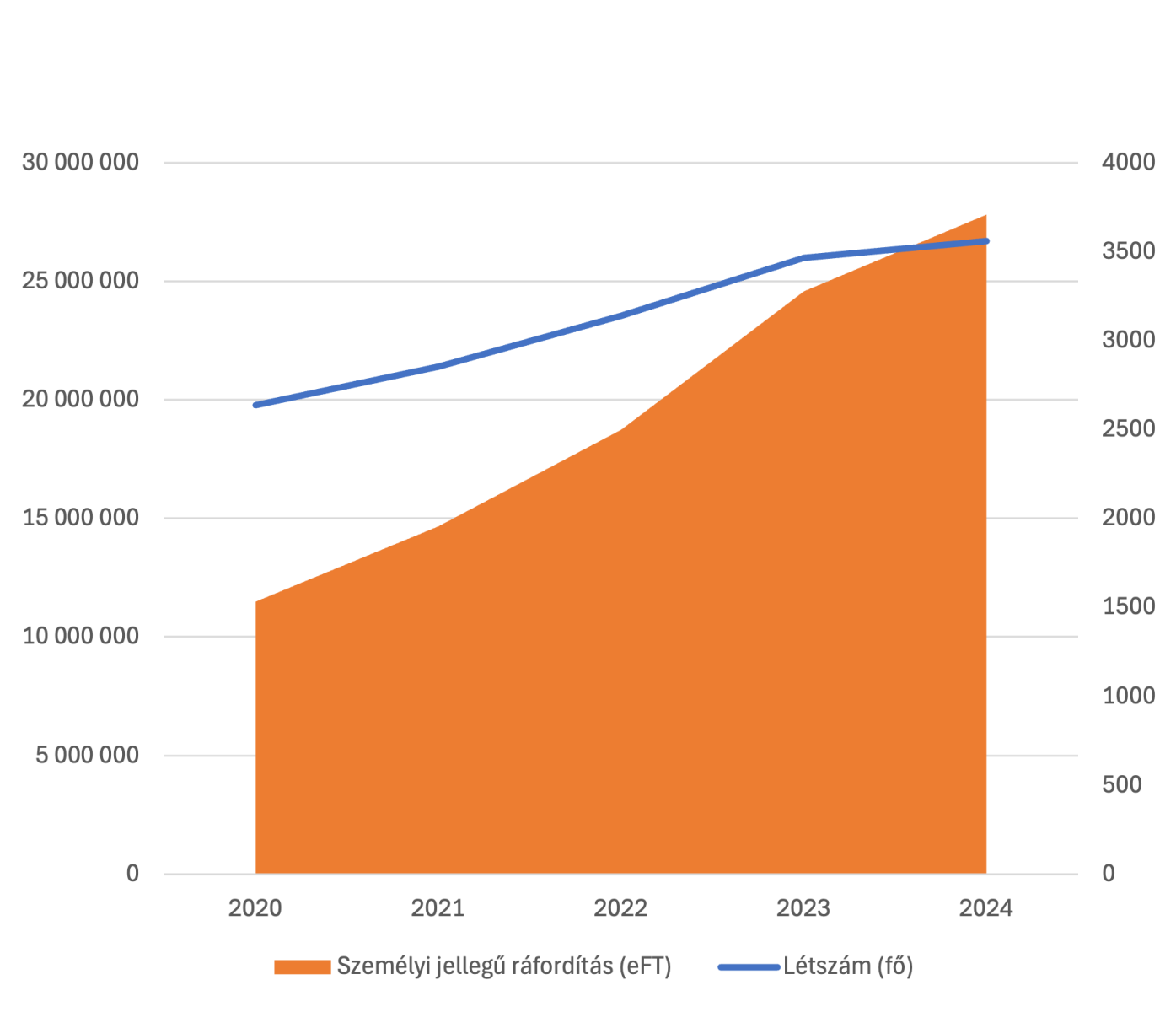 A befizetett adó összege ugyan 818 millió forintra nőtt, de az árbevételhez viszonyított aránya 1% alá csökkent. Ez a látszólagos könnyebbség valójában az árbevétel erőteljesebb növekedéséből fakad, miközben a költségoldal – különösen a személyi jellegű ráfordítások – folyamatosan felfelé húzza a kiadásokat.