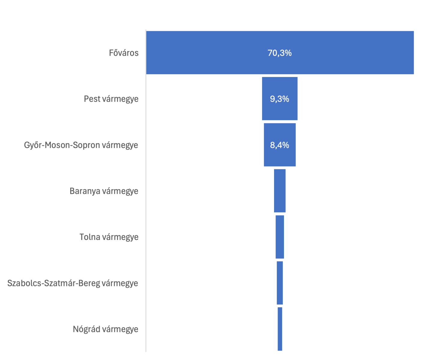 A bevétel földrajzi szerkezete változatlanul Budapest-centrikus. A főváros adja az árbevétel több mint 70%-át, amit Pest megye (9,3%) és Győr-Moson-Sopron megye (8,4%) követ. A vidéki megyék többsége inkább kiegészítő szereplő maradt, arányaik jellemzően 1–3% között mozognak. A legkisebb súllyal Hajdú-Bihar, Vas és Somogy jelenik meg, ahol a teljes árbevétel alig néhány tizedszázaléka képződik.