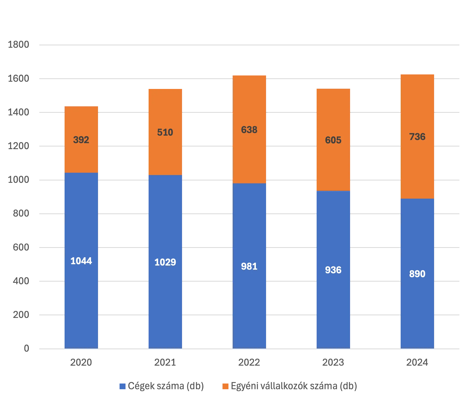 Érdekes fordulat ugyanakkor az egyéni vállalkozások térnyerése: számuk 2020 és 2024 között 392-ről 736-ra nőtt, miközben arányuk a teljes mezőnyön belül 27,3%-ról 45,3%-ra emelkedett. Ez jól mutatja, hogy a szektor szerkezete eltolódik a kisebb, rugalmasabb szereplők felé.