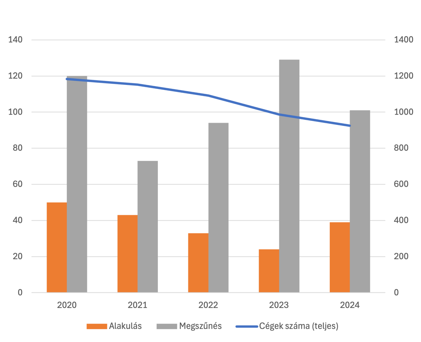 Új cégek ugyan érkeztek – 39 alapítás történt –, de a szám nem tudta ellensúlyozni a kilépéseket. Így a piac egyre koncentráltabb: kevesebb, de jellemzően nagyobb tapasztalattal és stabilabb háttérrel rendelkező szereplő marad talpon.
