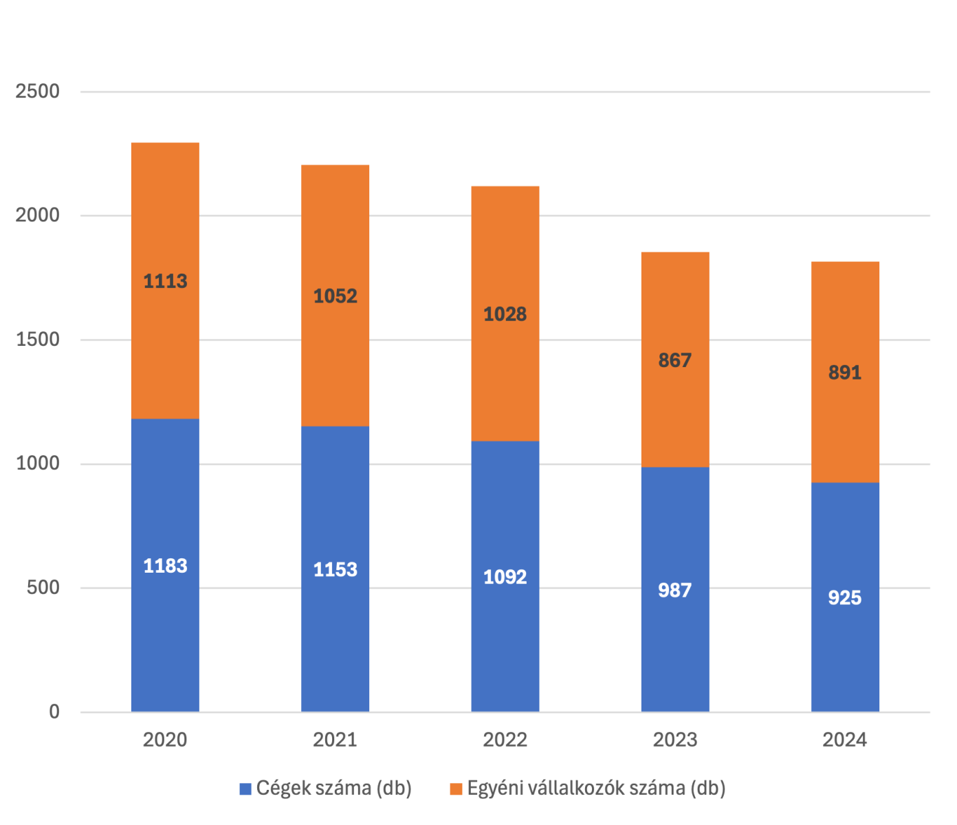 Az egyéni vállalkozások jelenléte továbbra is erős: 2024-ben 891 egyéni vállalkozó működött, közülük 689 volt aktív. Az aktivitási arány így 77% körül állt, és a teljes szektor közel felét adták. Ez a bázis fontos rugalmasságot biztosít a piacnak, hiszen gyorsan tudnak reagálni a változó igényekre, ugyanakkor a kisebb méret miatt sokuk nehezebben viseli a tartós pénzügyi nyomást.
