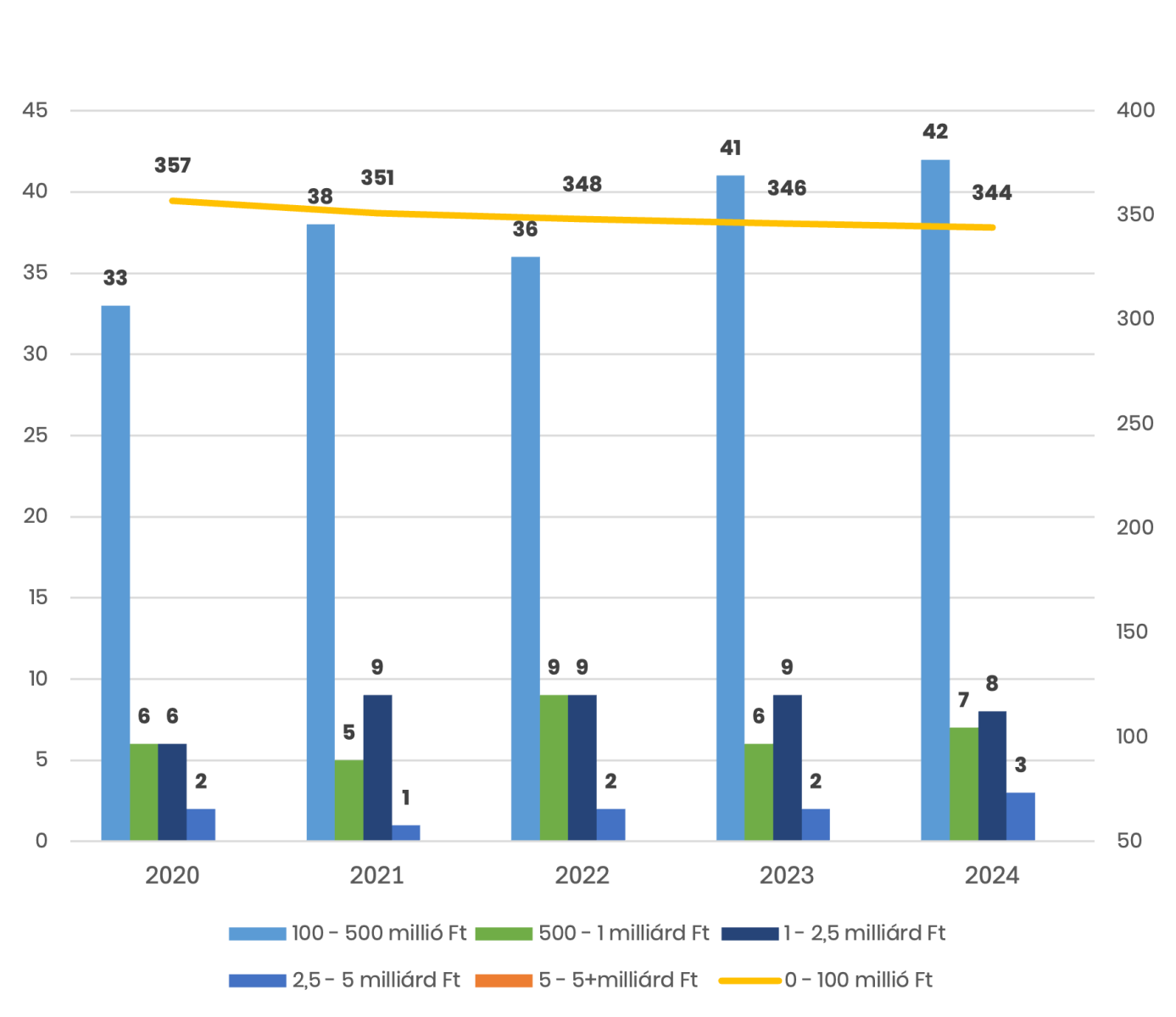 Az árbevétel-kategóriák bontása szinte tankönyvszerűen mutatja a szektor szerkezetét. A legalsó sávban, 100 millió forint alatti bevétellel, 344 cég működik – ők adják a mezőny széles alapját, de gazdasági súlyuk korlátozott. A következő lépcsőfok, a 100–500 milliós kör, már jóval szűkebb: mindössze 42 vállalat tartozik ide, akik stabil középréteget alkotnak. A félmilliárd és egymilliárd közötti sávban pedig mindössze 7 szereplőt találunk, akik már komolyabb súlyt képviselnek.