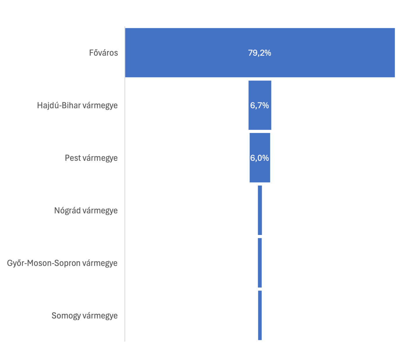 Területi eloszlásban a főváros viszi a prímet: egyedül Budapest adja a teljes árbevétel 79%-át. Pest megye 6%-kal, Hajdú-Bihar 6,7%-kal emelkedik ki, de az ország többi részén legfeljebb 1–2%-os arányt látunk. A vidéki jelenlét tehát továbbra is mérsékelt, a szektor gazdasági ereje erősen Budapestre koncentrálódik.