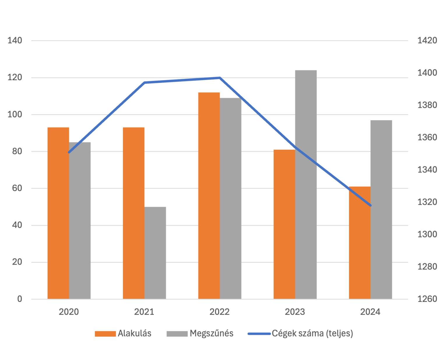 A PR-szektor szerkezete látványos átrendeződést mutat. A működő társas vállalkozások száma 2024-ben 1 318-ra csökkent, folytatva az elmúlt évek lassú visszaszorulását (2020-ban még 1 351 volt). Bár új alapítások is történtek – 61 cég indult el –, ezt bőven ellensúlyozta a 97 megszűnés, ráadásul ezek közel 60%-a rendezetlen módon zajlott. Ez a magas arány jelzi, hogy a szektor jelentős része sérülékenyebb üzleti alapokon áll.