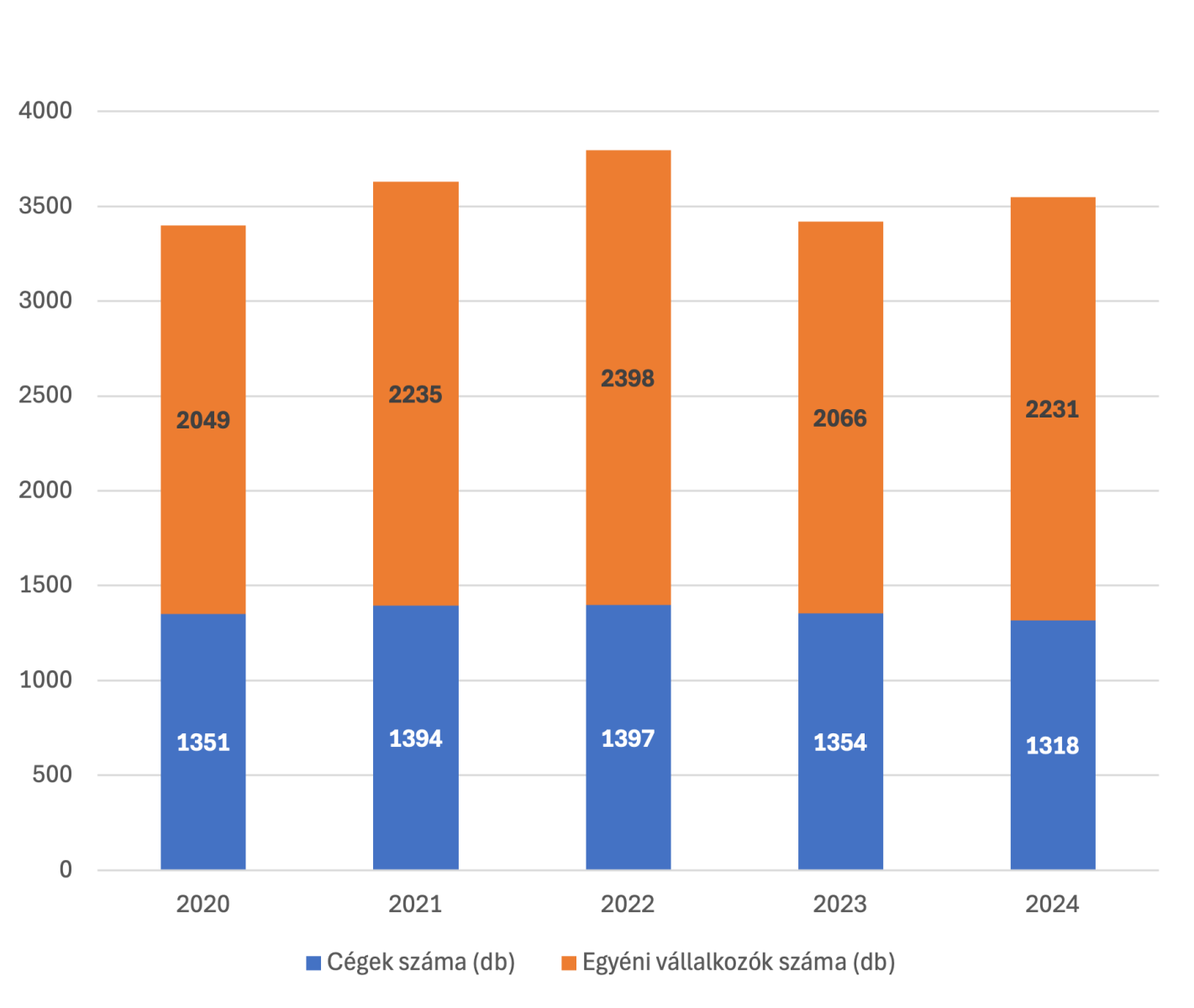 Ezzel szemben az egyéni vállalkozások tere erősödik: 2024-ben 2 231 vállalkozót tartottak nyilván, ami az elmúlt évek egyik legmagasabb értéke. Az aktivitás is magas, a vállalkozások több mint 73%-a ténylegesen működik. Ez egyszerre mutatja a szektor rugalmasságát és azt, hogy sokszor kisebb erőforrásokra épülő, könnyebben sérülő szereplők tartják életben a piacot.