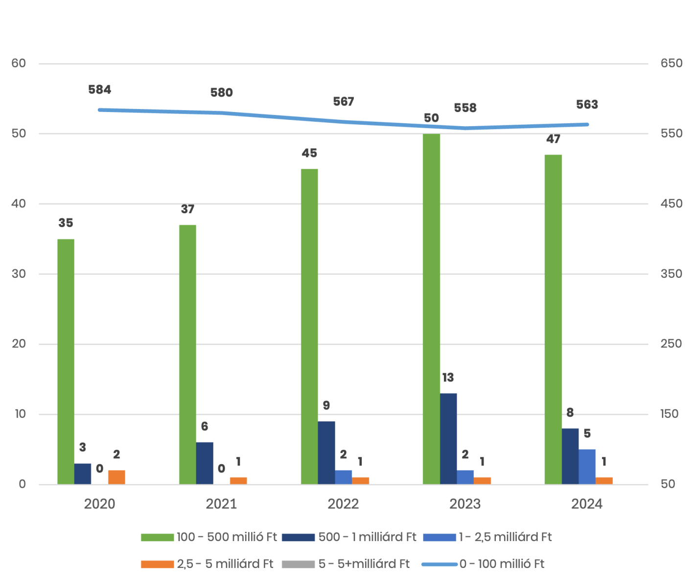 A kategóriák bontásában is kirajzolódik a kép: a cégek túlnyomó része (563) 100 millió forint alatti bevétellel dolgozik, míg a középső sávban – 100 és 500 millió forint között – 47 vállalkozás található. Az igazán nagy szereplők köre szűk: mindössze 8 cég 500 millió és 1 milliárd forint között, 5 vállalat 1–2,5 milliárd között, és egyetlen szereplő 2,5–5 milliárdos nagyságrendben. Öt milliárd felett továbbra sincs senki – a szektorban az „óriások” hiánya állandó tényező.