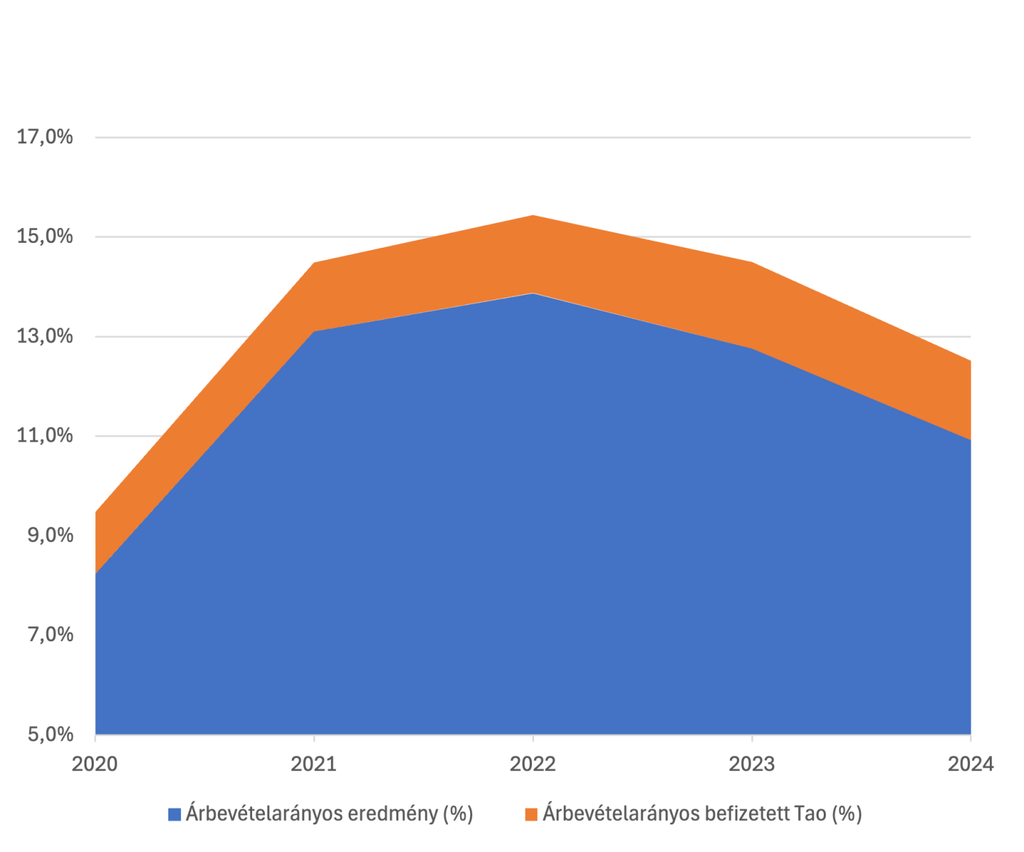 2024-ben az árbevételarányos eredmény 10,9%-ra olvadt, ami érezhető visszalépés a korábbi évekhez képest: 2022-ben még közel 14%-ot ért el, 2023-ban pedig 12,8%-ot. A trend világos: a nyereségesség tartósan gyengül, a cégek mozgástere szűkül.