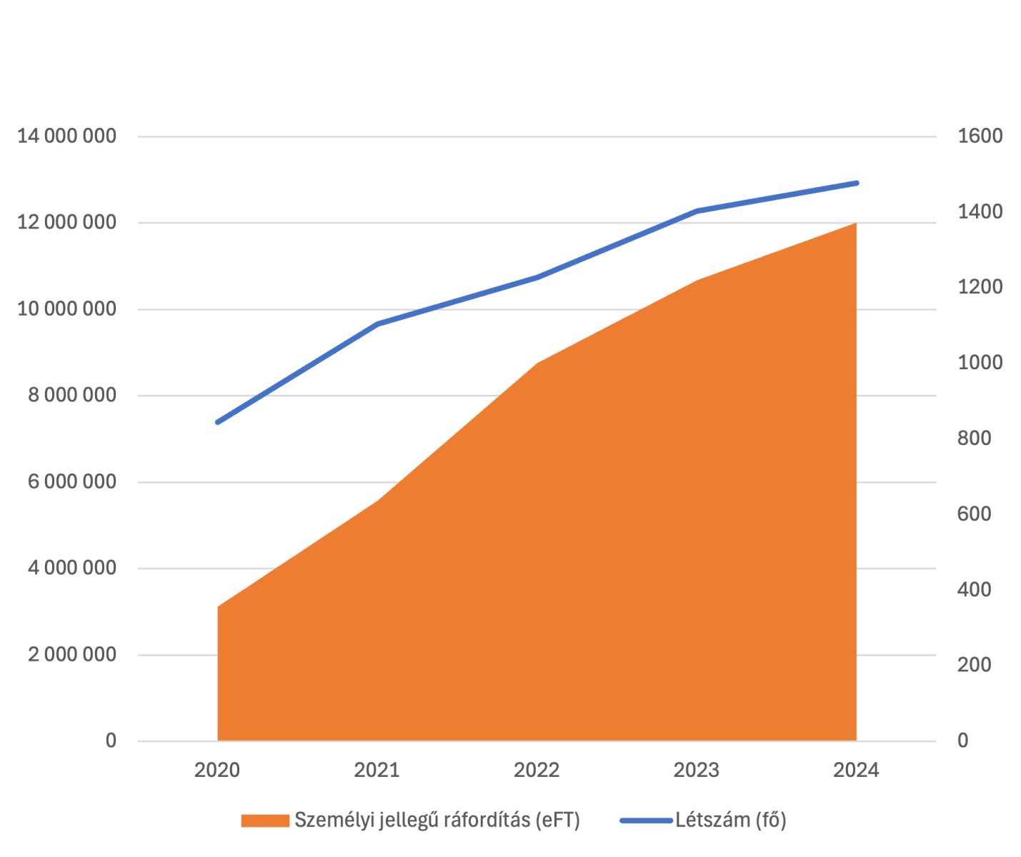 A személyi jellegű ráfordítások viszont folyamatosan gyorsuló pályán mozognak: 2020-ban még alig 3,1 milliárd forintot tettek ki, 2024-re pedig 12 milliárd forint fölé emelkedtek. Ez több mint négyszeres növekedést jelent öt év alatt. Bár a dinamika mérséklődött a korábbi, 70–80%-os ugrásokhoz képest, még mindig kétszámjegyű a bővülés.