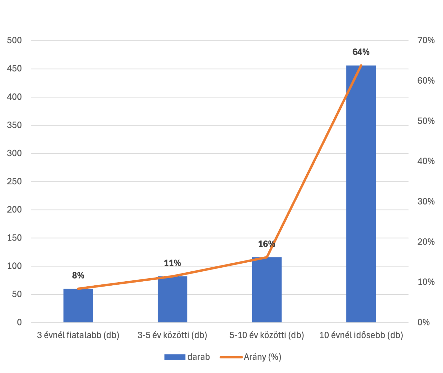 A struktúrát kétpólusú szerkezet jellemzi: a cégek közel kétharmada (64%) több mint 10 éve stabil szereplő, miközben minden harmadik vállalkozás 10 éven belül alapított. A legfrissebb hullámot a három évnél fiatalabb cégek jelentik, amelyek a teljes kör 8%-át adják. Ez egyszerre mutatja a piac stabil bázisát és a folyamatosan érkező utánpótlást.