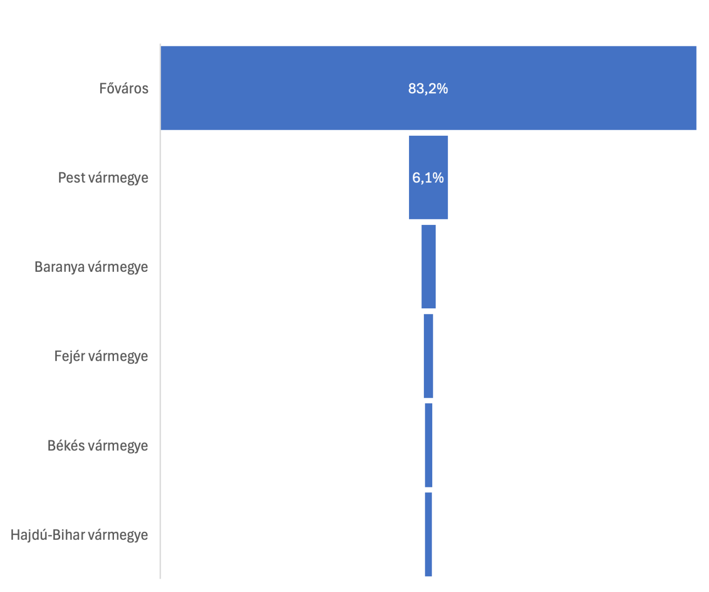 A PR-szektor térképe első ránézésre is egyértelmű: Budapest uralja a pályát. A 2024-es adatok szerint az országos árbevétel több mint 83%-a a fővároshoz kötődik, miközben a foglalkoztatásban „csupán” 74%-os a részesedése. Ez azt mutatja, hogy Budapesten jóval magasabb az árbevétel koncentrációja, mint a munkaerőé – vagyis itt kevesebb ember termel jóval nagyobb bevételt.