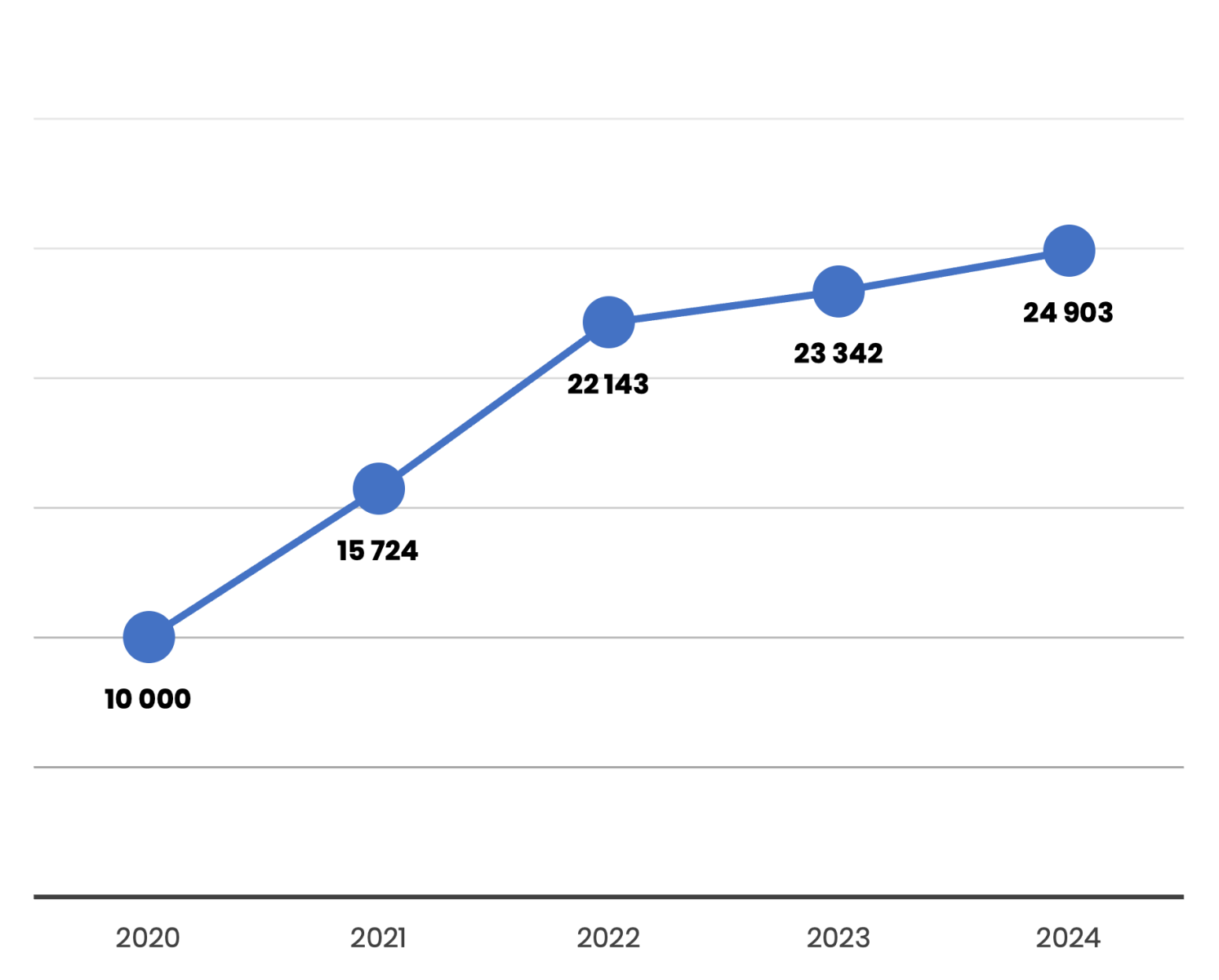 A rendezvényszektor indexe 2024-ben 24 903 pontnál állt meg, ami bő négy év alatt több mint kétszeres növekedést jelent. Az ugrás hátterében nem csupán az organikus fejlődés áll: a 2020-as bázisév rendkívüli mélypont volt a Covid-zárások miatt, innen indult a szektor egyfajta „újraéledése”. A 2021-es és 2022-es években még robusztus emelkedés látszott, azóta viszont a dinamika fokozatosan mérséklődik.