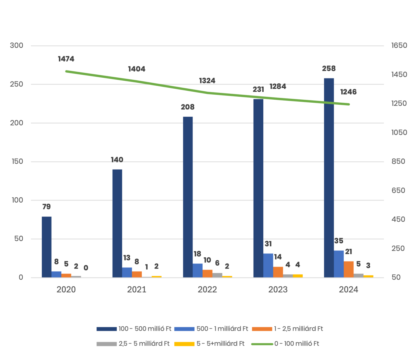 A növekedés mögött azonban erős koncentráció áll: a piac 80%-át mindössze a cégek 7,9%-a – 140 vállalkozás – termelte meg. Az árbevétel-kategóriák bontása is ezt erősíti: a kisebb, 100 millió forint alatti kör továbbra is a vállalatok többségét adja (1246 cég), de a középmezőny fokozatosan erősödik. A 100–500 milliós sávban 258 cég található, míg az 500 millió és 1 milliárd közötti bevétellel 35 vállalkozás zárta az évet. A valódi húzóerőt azonban a milliárdos kategóriák adják: az 1–2,5 milliárd közötti sávban 21, a 2,5–5 milliárdos körben 5, míg az 5 milliárd fölötti ligában 3 cég működik.