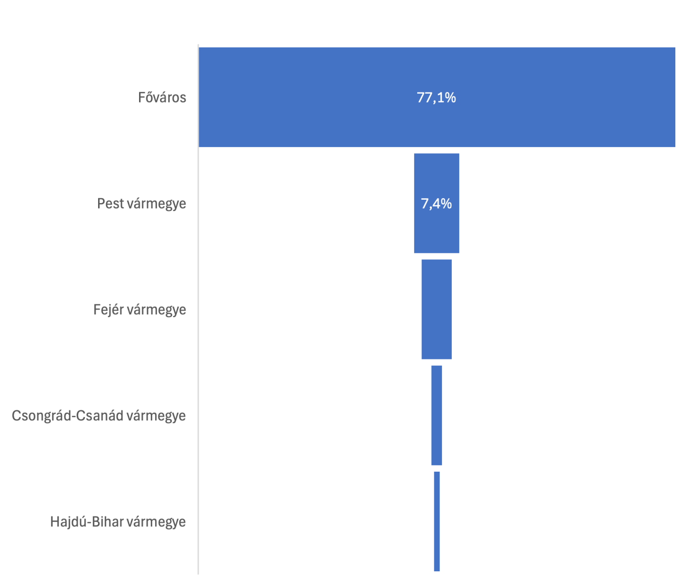 A területi megoszlás szinte egyirányú: a fővárosban realizált 205 milliárd forint árbevétel a teljes piac több mint háromnegyedét, 77%-át adja. Pest megye további 7,4%-kal járul hozzá, Fejér megye közel 5%-os súlya pedig szintén számottevő. Ez egyértelműen mutatja, hogy a szektor döntő hányada a fővárosi és központi régióhoz kötődik, míg a vidéki térségek összességében a teljes bevétel alig ötödét termelik.